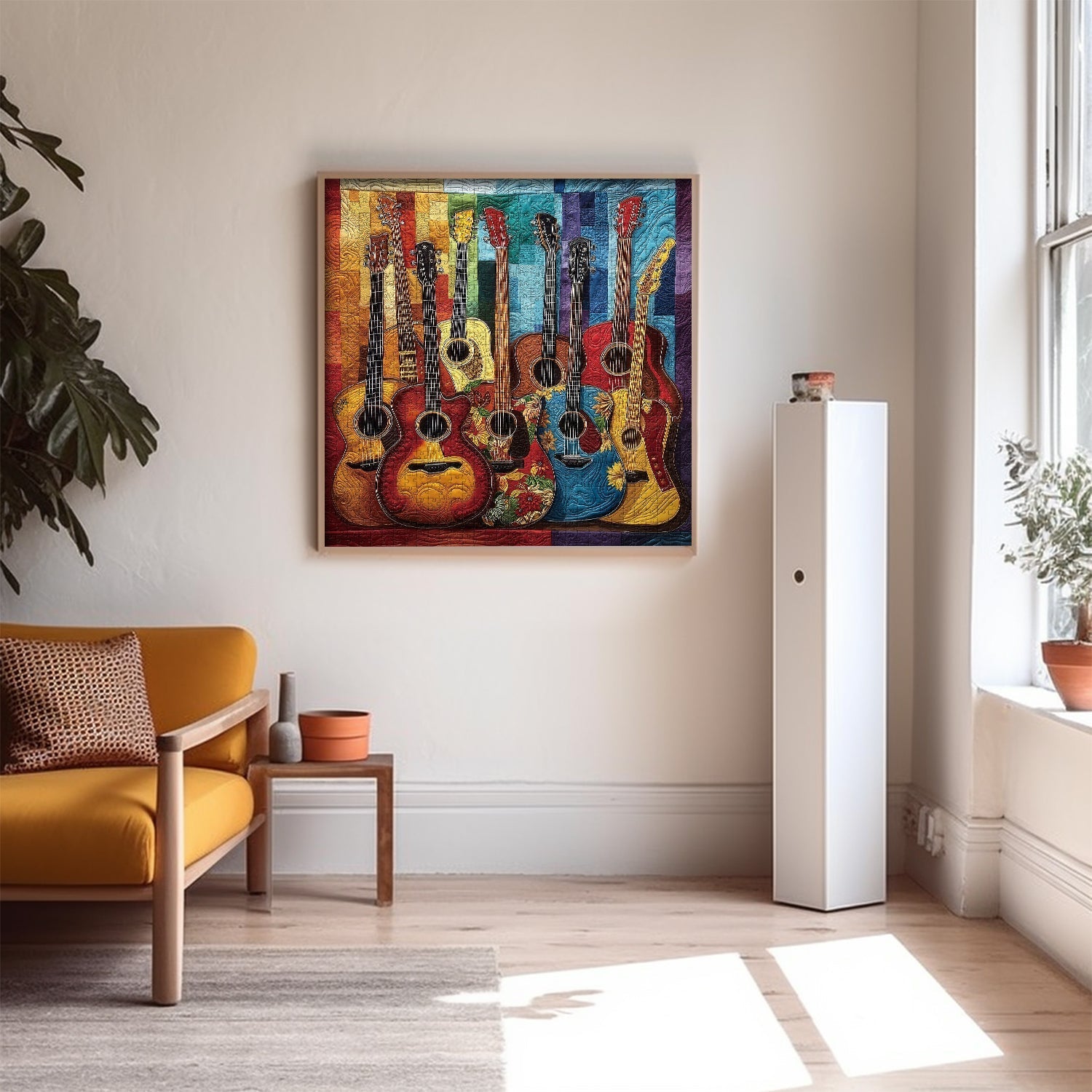 Quilted Background: The background consists of a quilt - like pattern with different colored patches, complementing the guitars and enhancing the textile art feel.