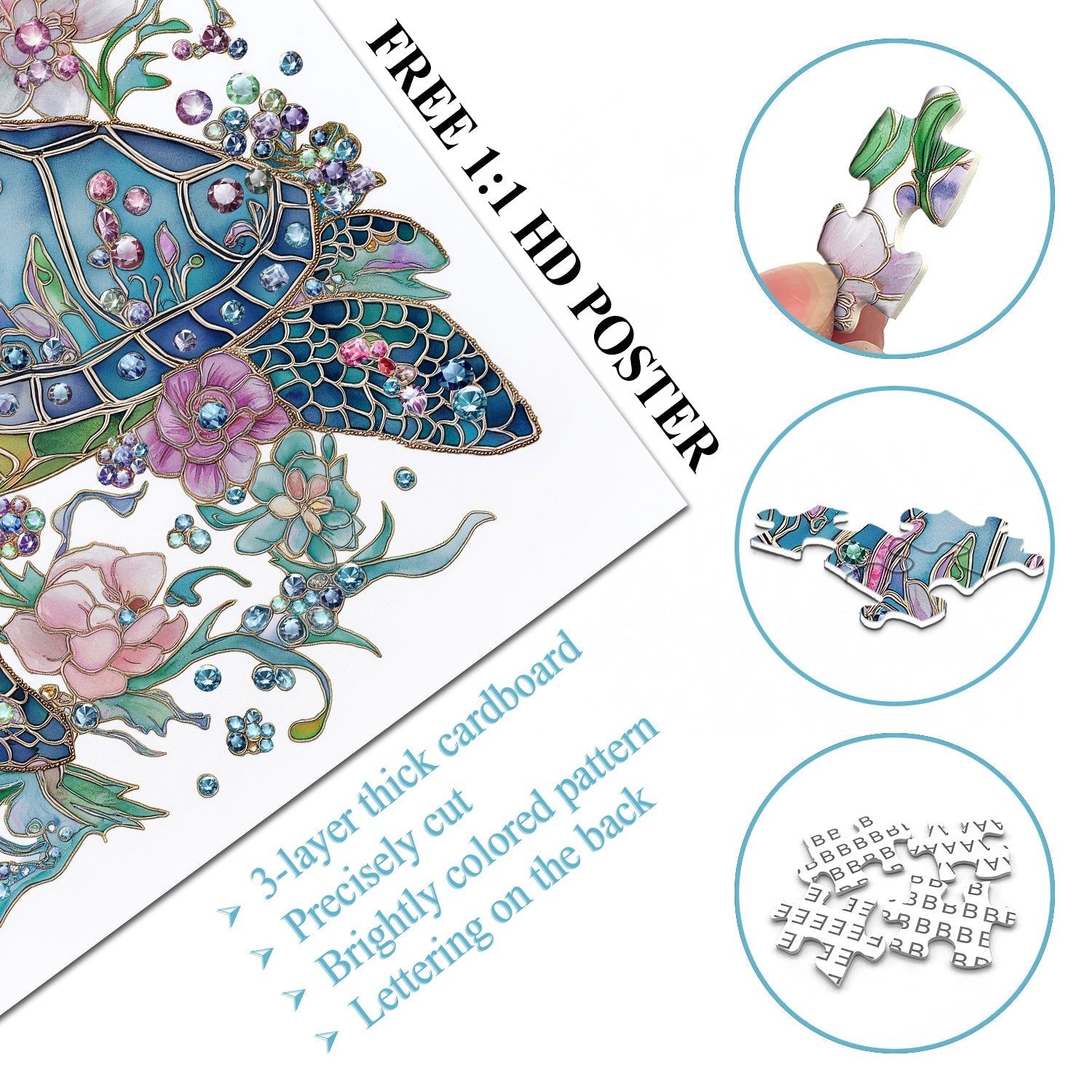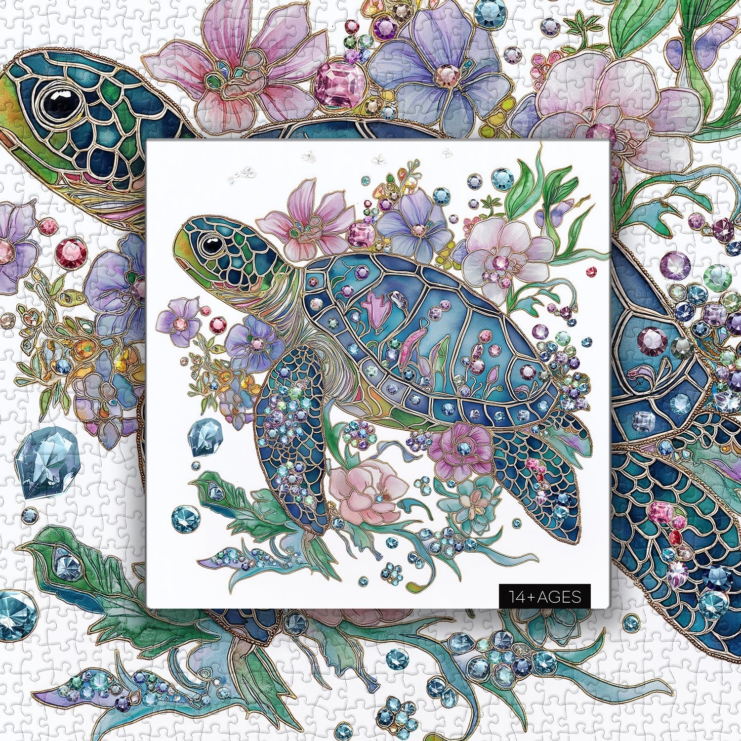 A Mesmerizing Ocean Jewel: Dive into a magical underwater world with the Shining Turtle Jigsaw Puzzle. This beautiful design features a sparkling blue-green turtle, its shell adorned with delicate, gemstone-crafted flowers that shimmer like treasures from the deep sea.