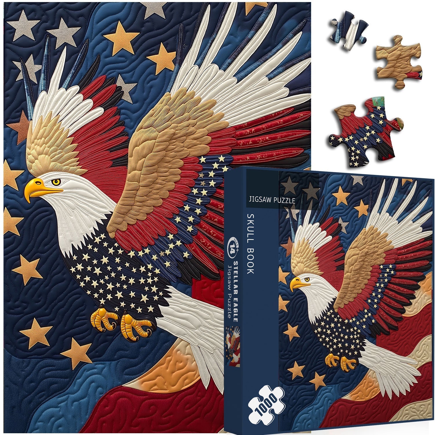 Star Elements: There are numerous stars in the background, in colors like gold and silver. Also, the eagle's body is decorated with small white stars, integrating the star motif into the eagle's design.